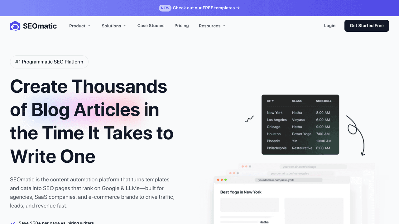 The use case: target long-tail keywords without spending months writing. Real estate sites create pages for "homes in [city]" across every city. B2B SaaS builds comparison pages or glossary entries for every relevant term.