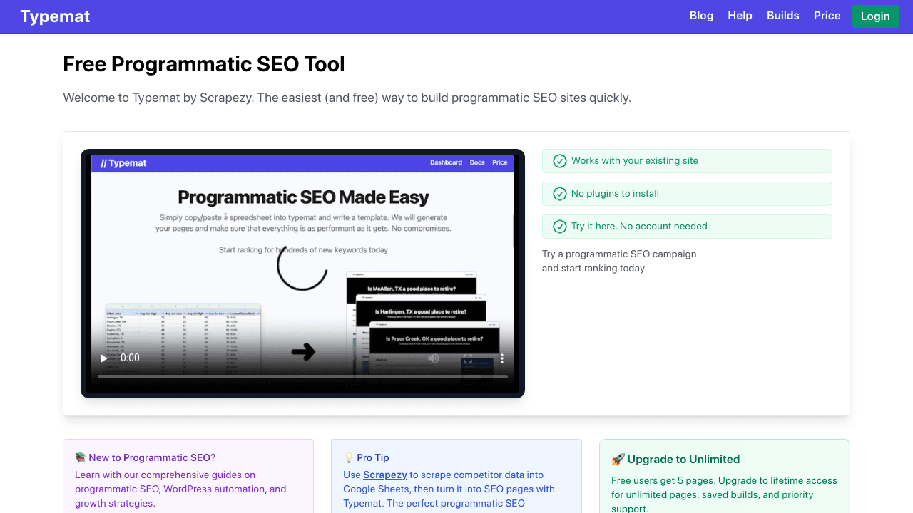 Typemat is your starting point if you're testing programmatic SEO on a budget. It's free for 5 pages and handles basic spreadsheet-to-WordPress conversion. But you'll outgrow it fast once you need AI content generation or automation beyond XML exports.